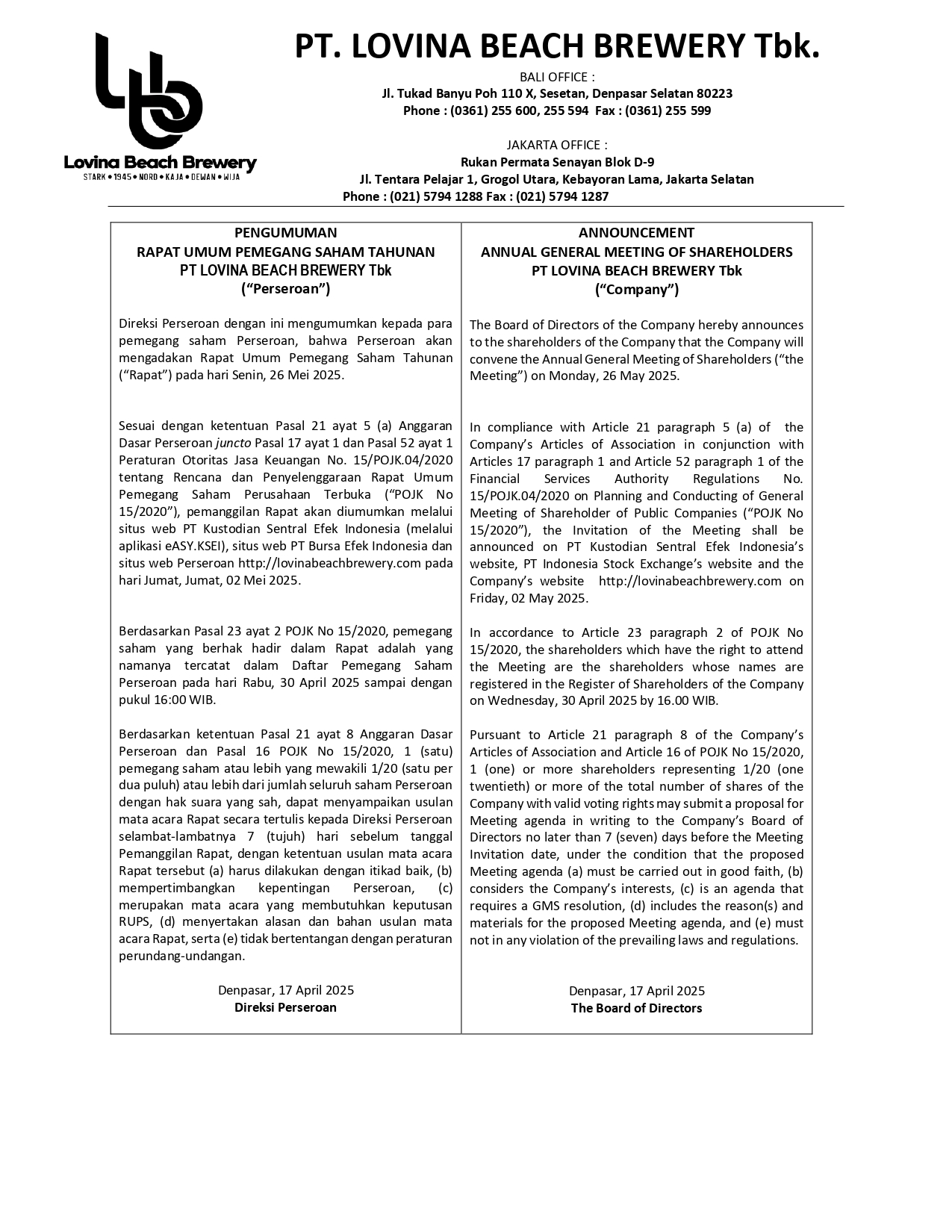 Sesuai dengan ketentuan Pasal 21 ayat 5 (a) Anggaran Dasar Perseroan juncto Pasal 17 ayat 1 dan Pasal 52 ayat 1 Peraturan Otoritas Jasa Keuangan No. 15/POJK.04/2020 tentang Rencana dan Penyelenggaraan Rapat Umum Pemegang Saham Perusahaan Terbuka (“POJK No 15/2020”), pemanggilan Rapat akan diumumkan melalui situs web KSEI, situs web Bursa Efek Indonesia dan situs web Perseroan http://lovinabeachbrewery.com pada hari Jumat, 02 Mei 2025.