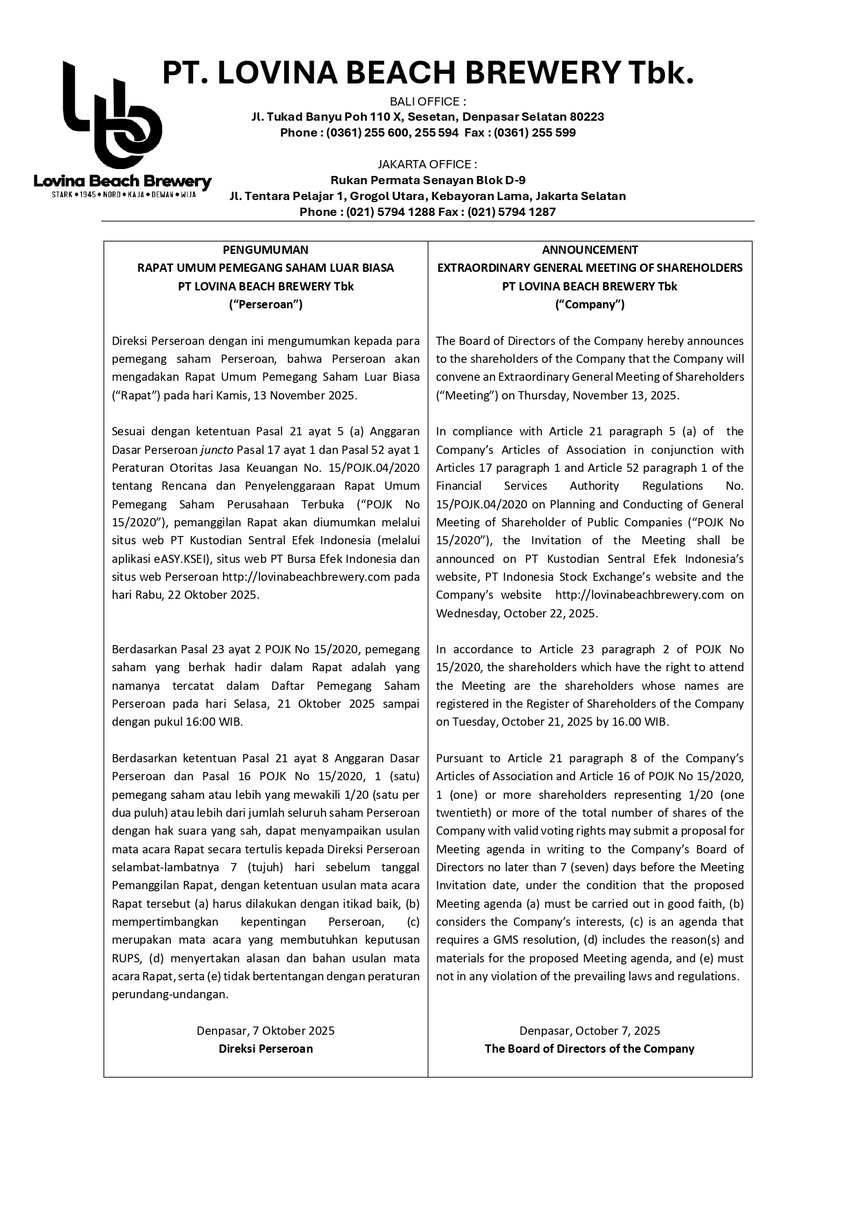 Sesuai dengan ketentuan Pasal 21 ayat 5 (a) Anggaran Dasar Perseroan juncto Pasal 17 ayat 1 dan Pasal 52 ayat 1 Peraturan Otoritas Jasa Keuangan No. 15/POJK.04/2020 tentang Rencana dan Penyelenggaraan Rapat Umum Pemegang Saham Perusahaan Terbuka (“POJK No 15/2020”), pemanggilan Rapat akan diumumkan melalui situs web PT Kustodian Sentral Efek Indonesia (melalui aplikasi eASY.KSEI), situs web PT Bursa Efek Indonesia dan situs web Perseroan http://lovinabeachbrewery.com pada hari Rabu, 22 Oktober 2025.